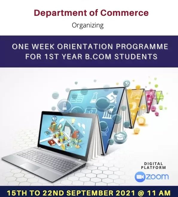 Department of Commerce, KLE Degree Day College, Nagarabhavi is organising ‘One week of Orientation Programme for 1st Year B.Com Students (on Zoom Platform)’ to be held from 15th to 22nd September 2021 at 11 A.M. All 1st Year Students are cordially requested to attend.
